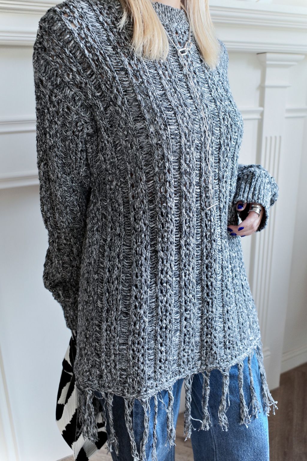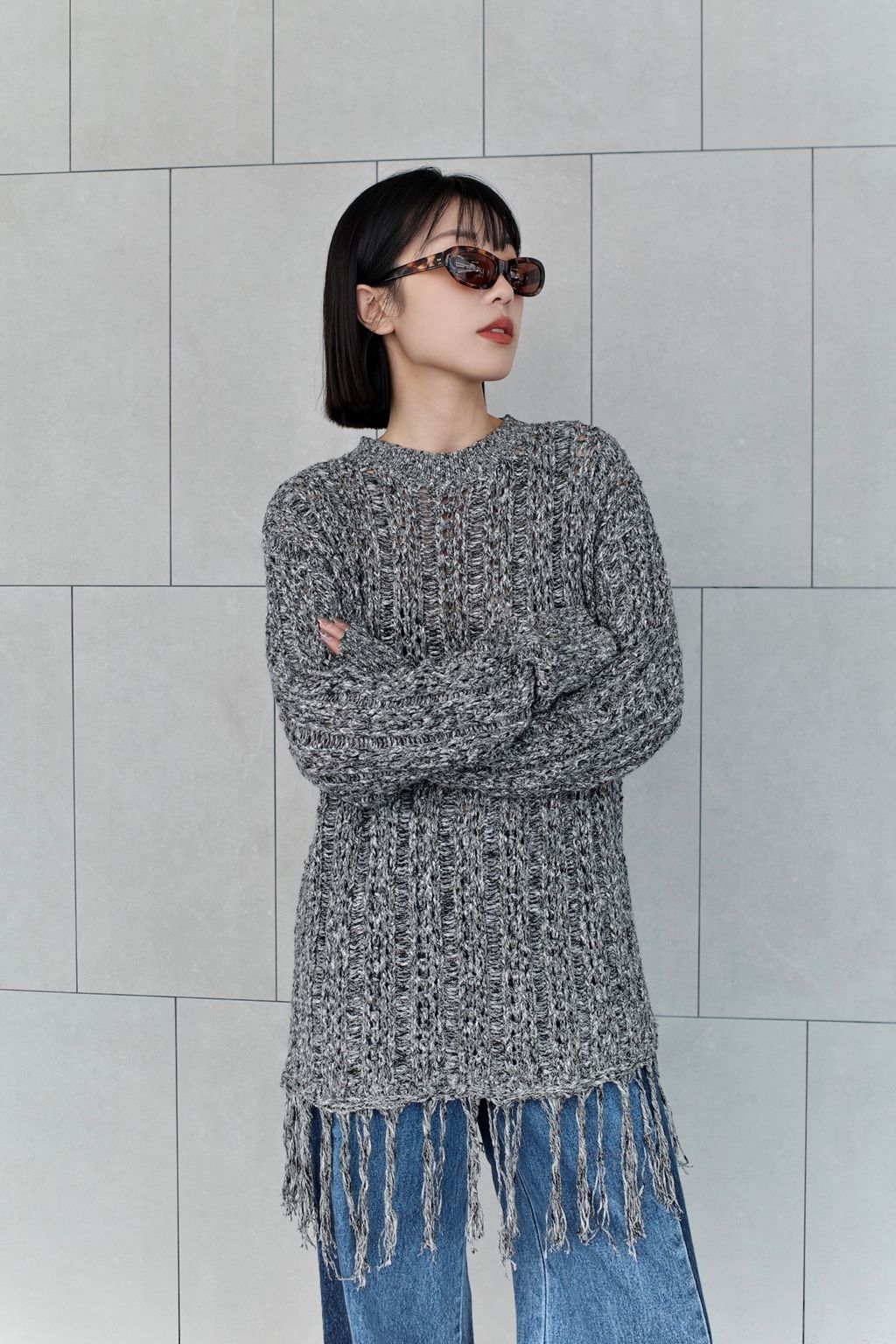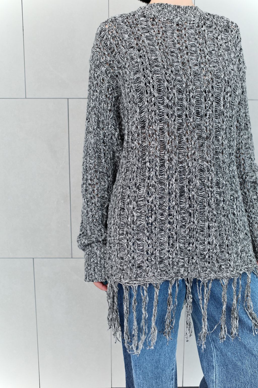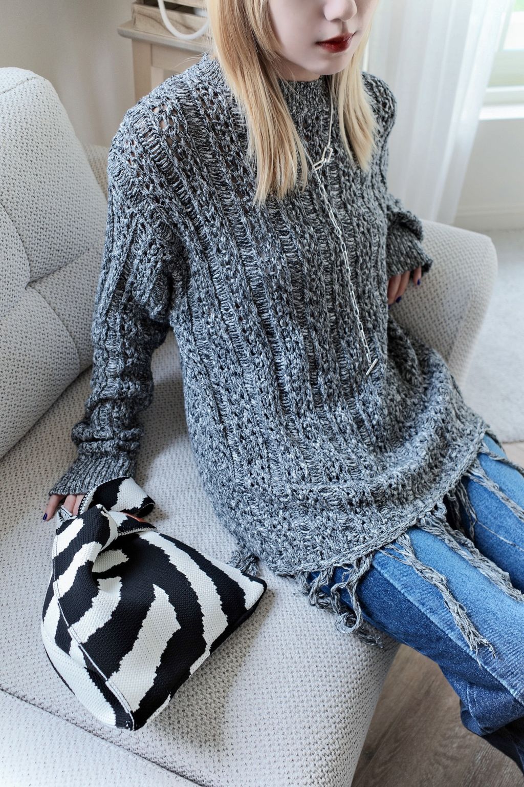 流蘇慵懶針織毛衣 - 灰色 / 乳白色