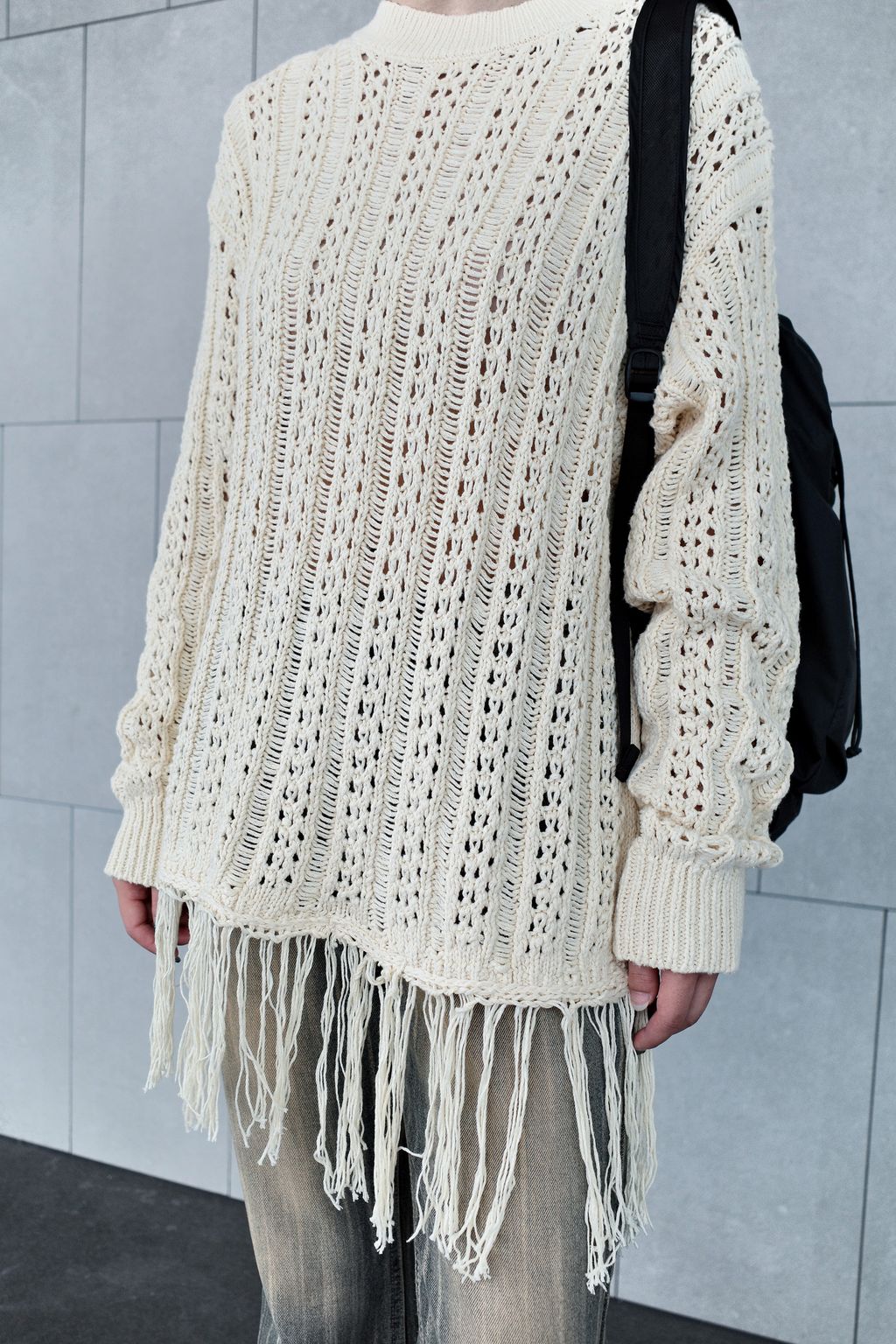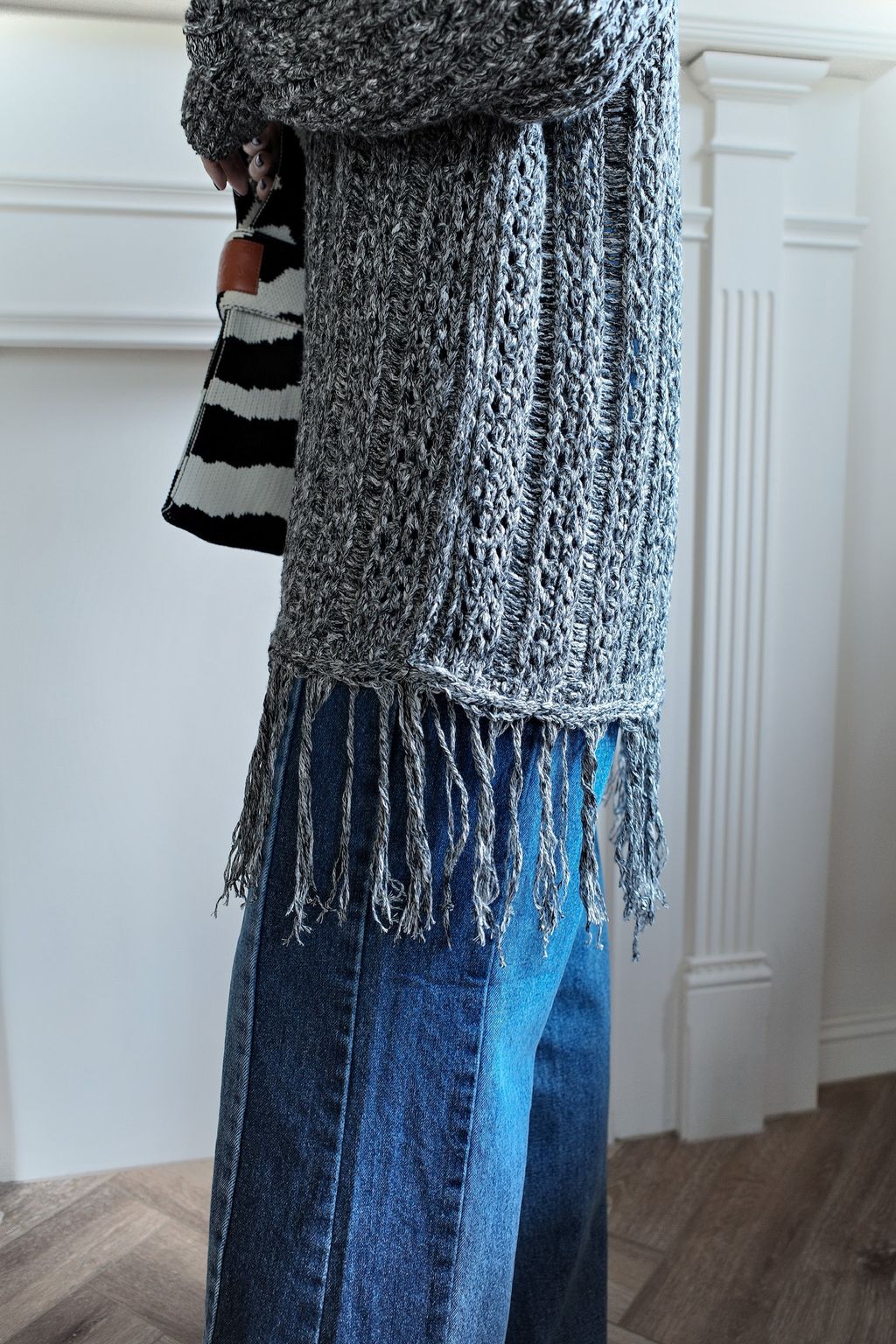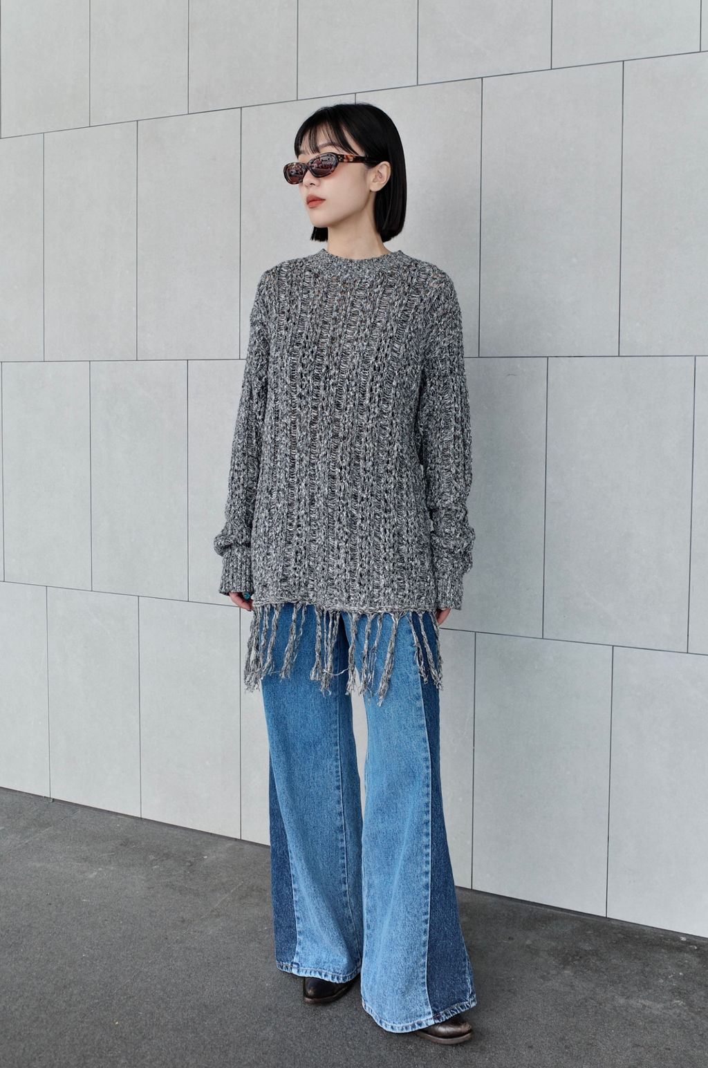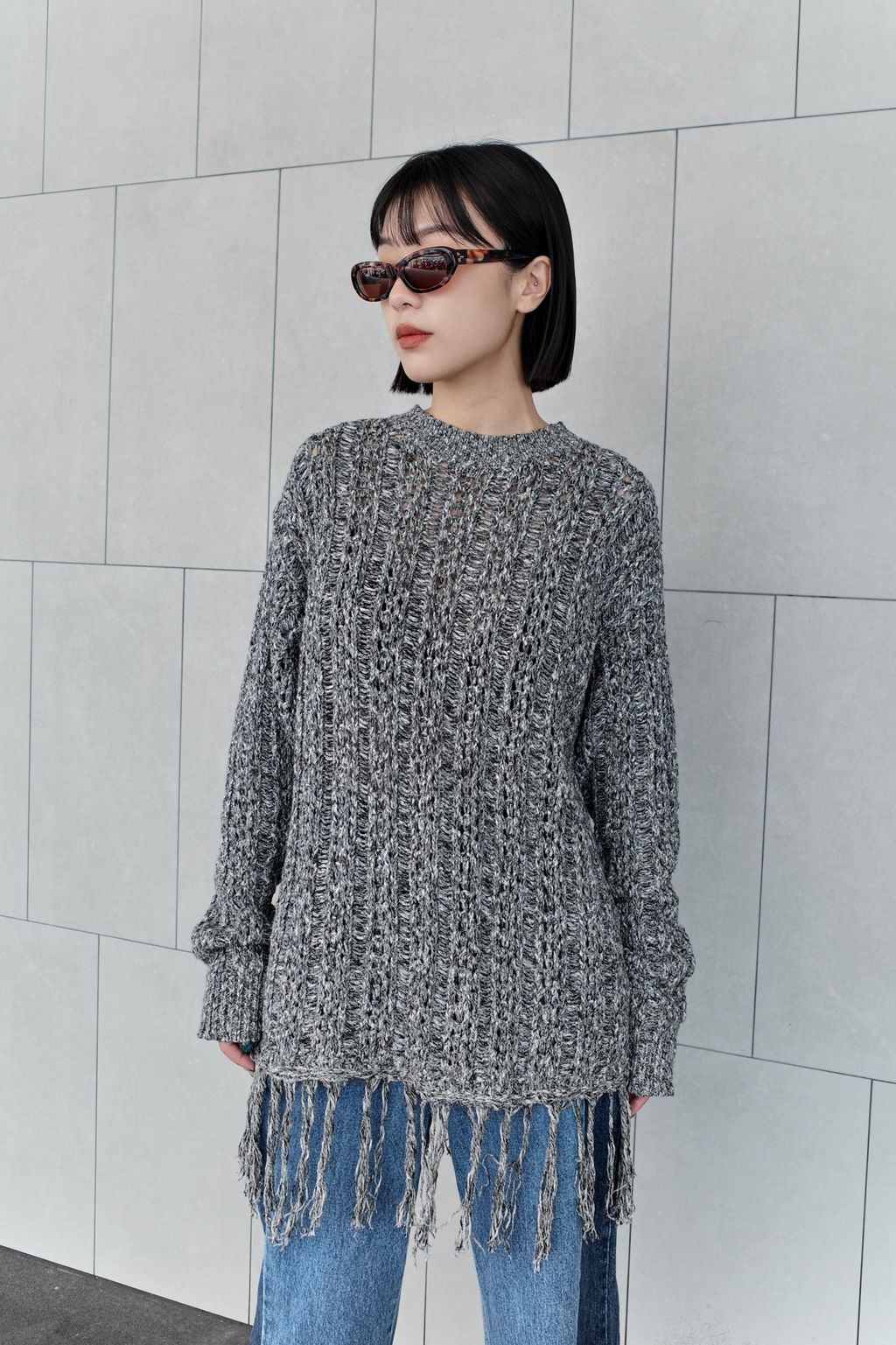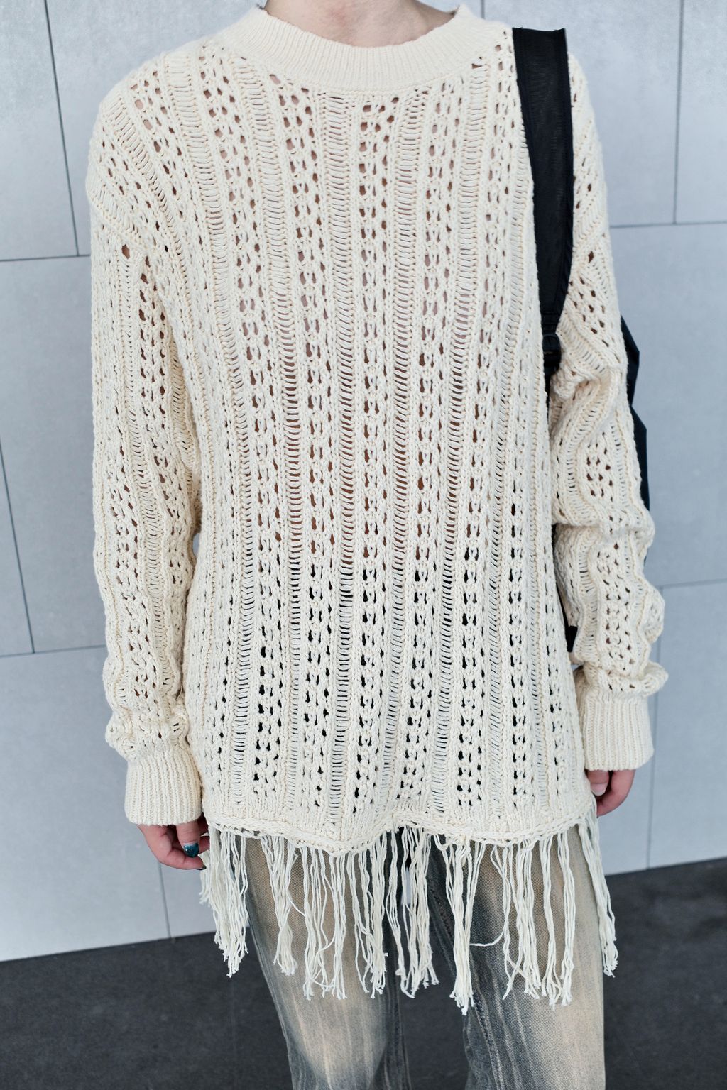 流蘇慵懶針織毛衣 - 灰色 / 乳白色