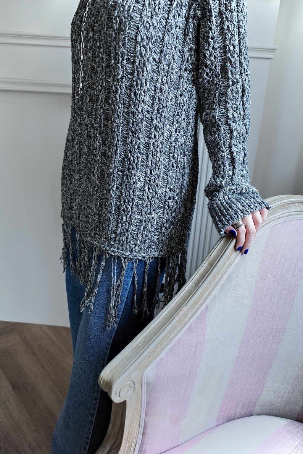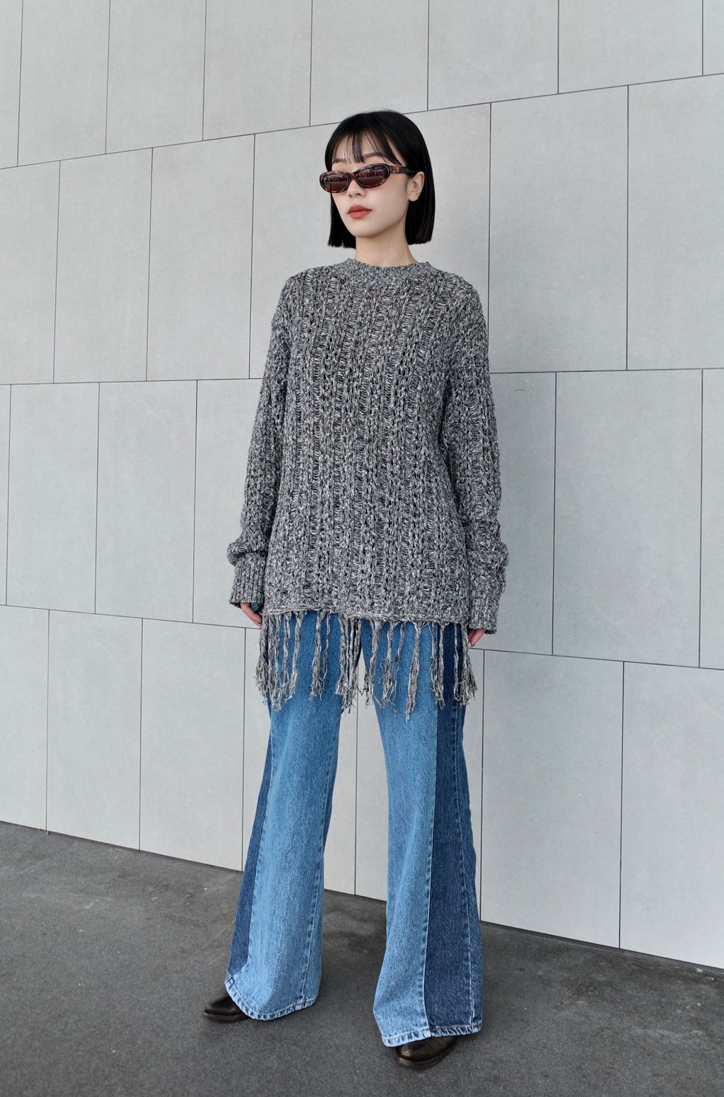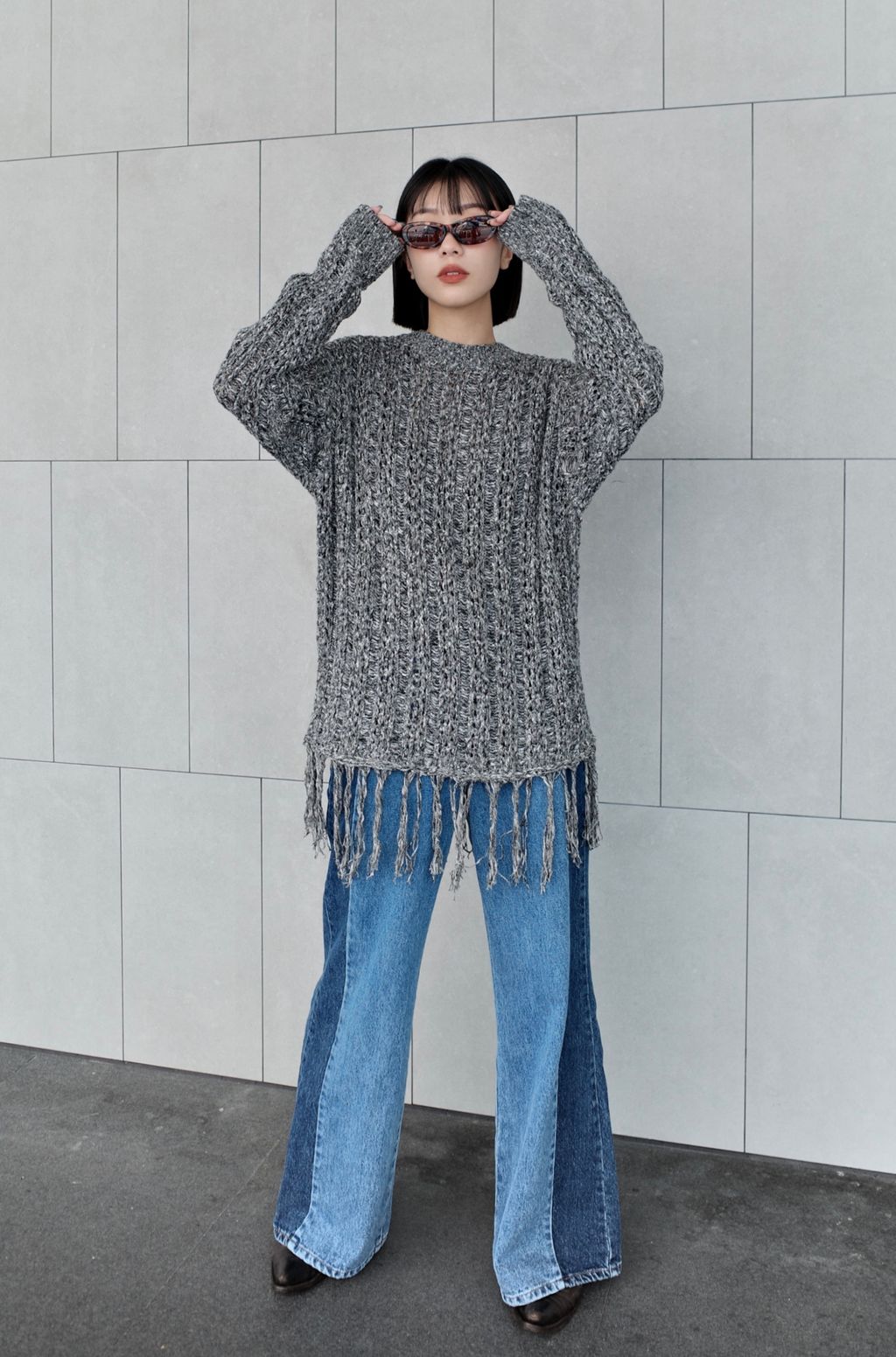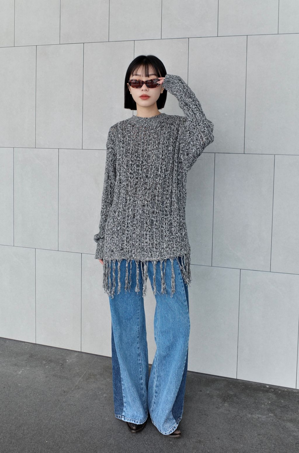 流蘇慵懶針織毛衣 - 灰色 / 乳白色