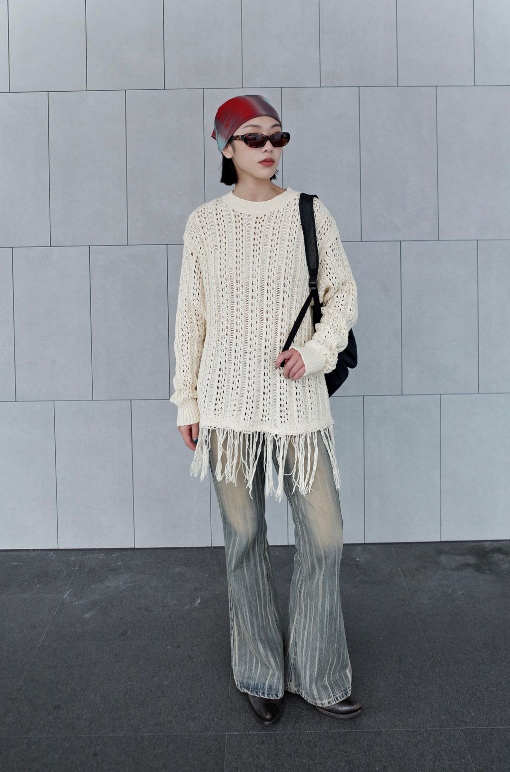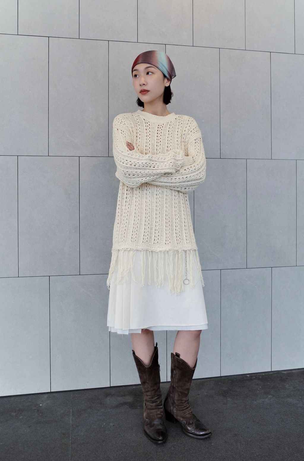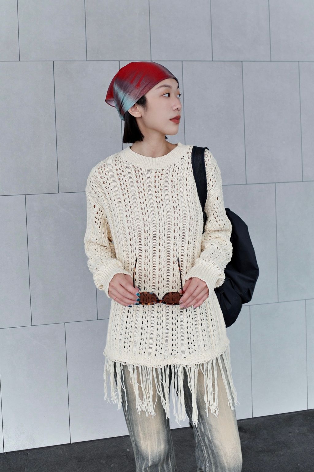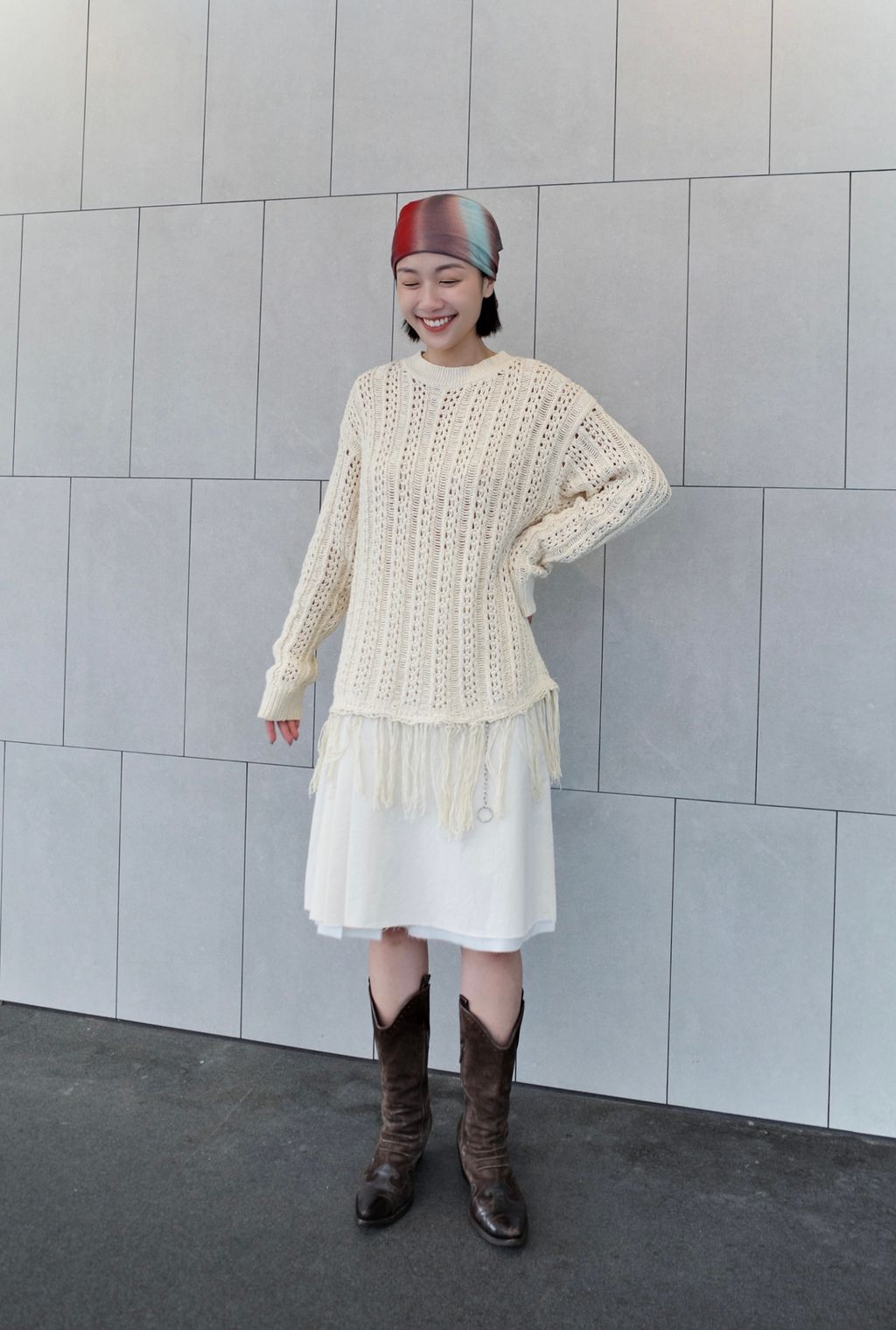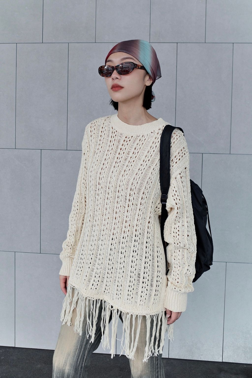流蘇慵懶針織毛衣 - 灰色 / 乳白色