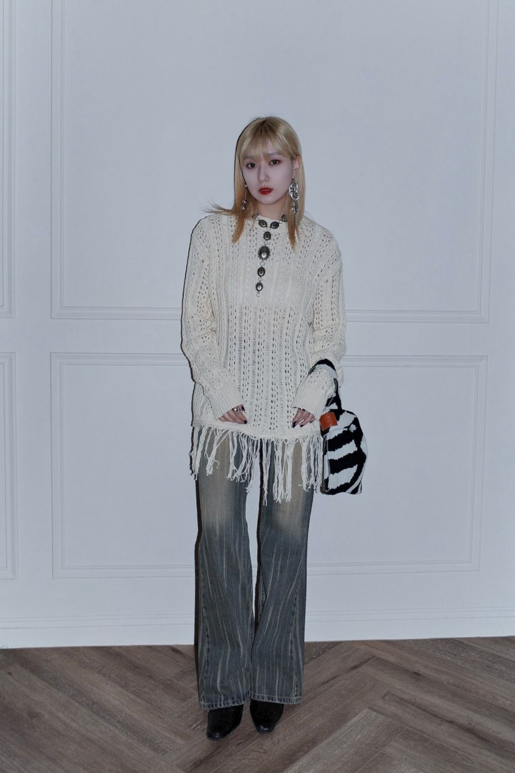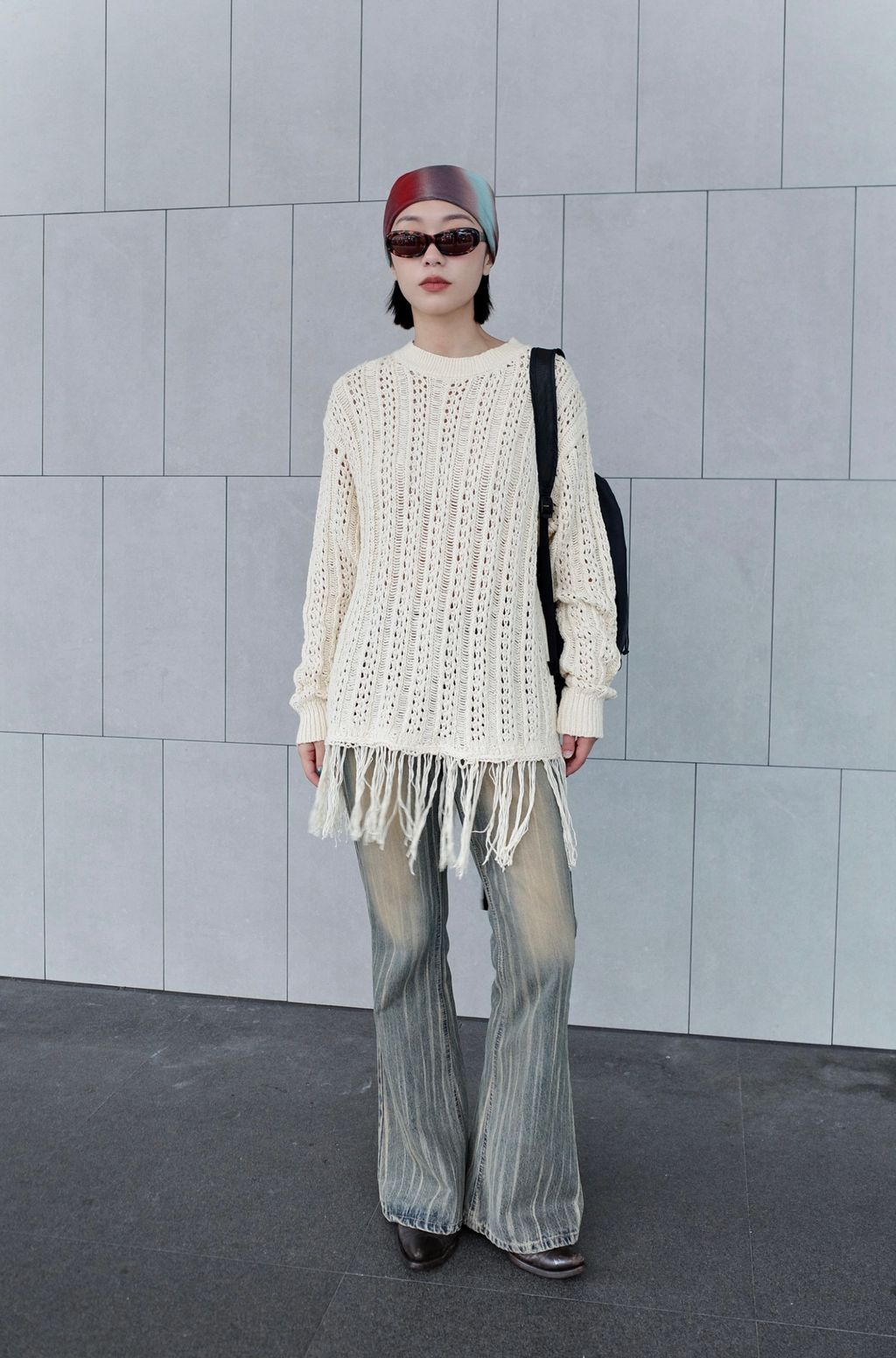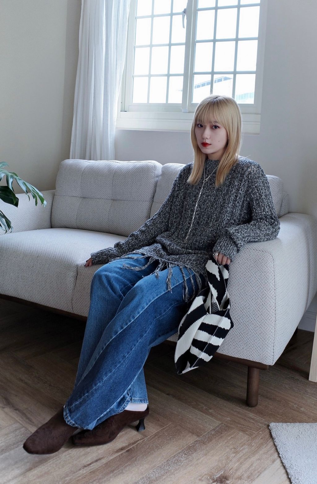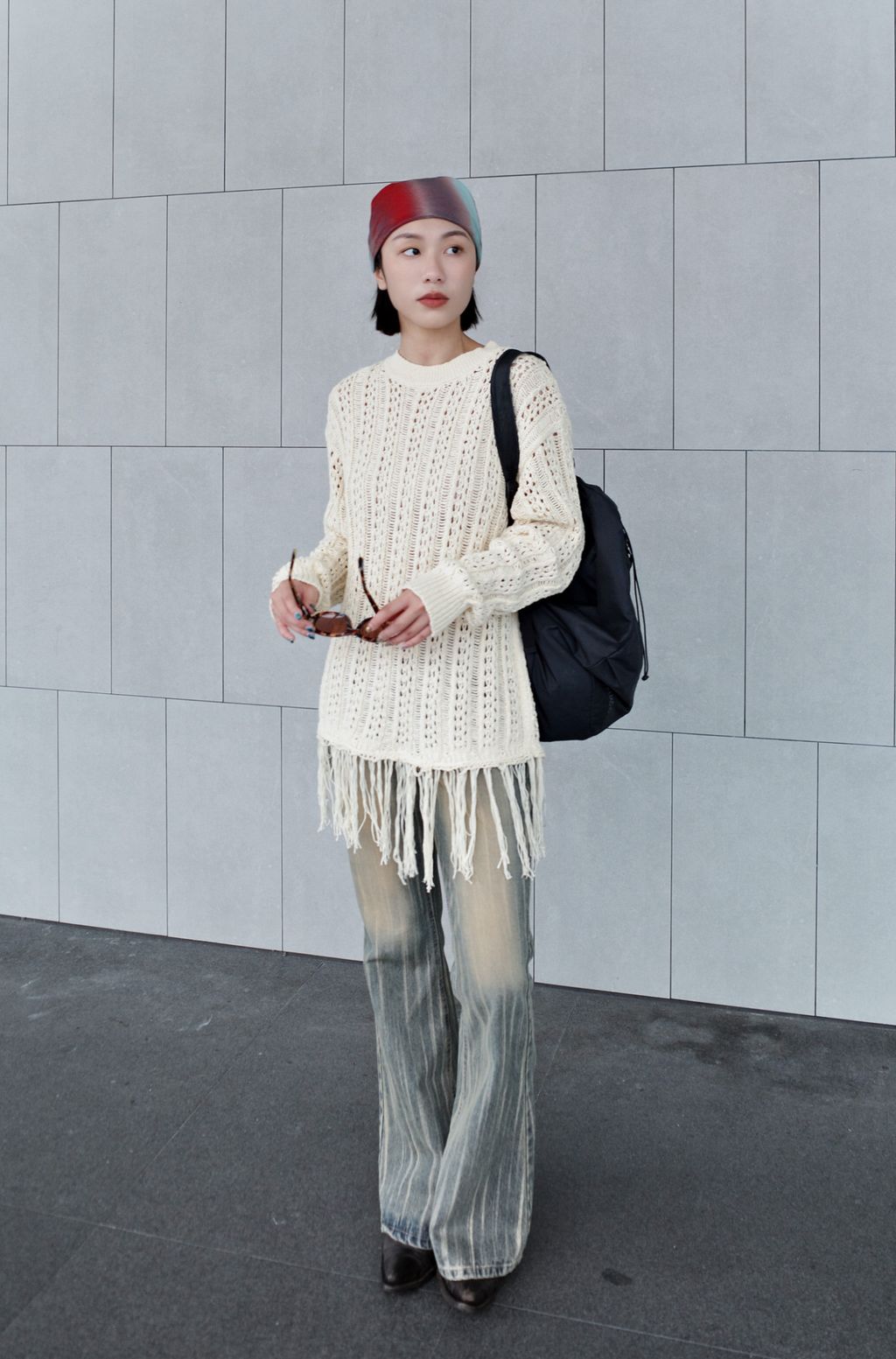 流蘇慵懶針織毛衣 - 灰色 / 乳白色