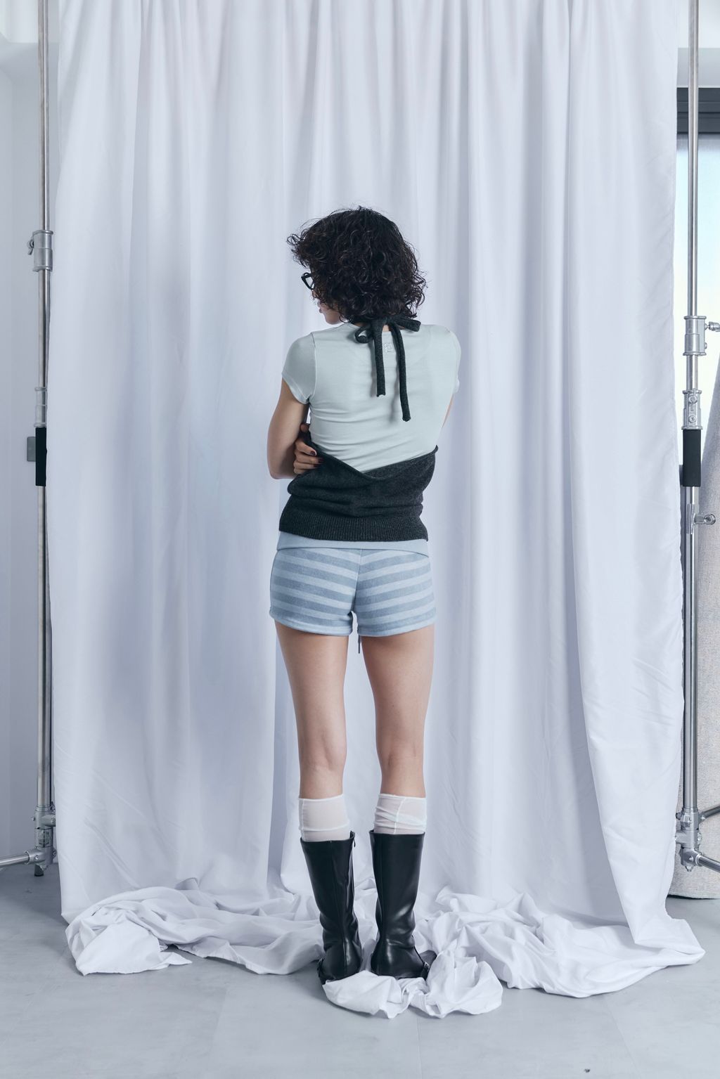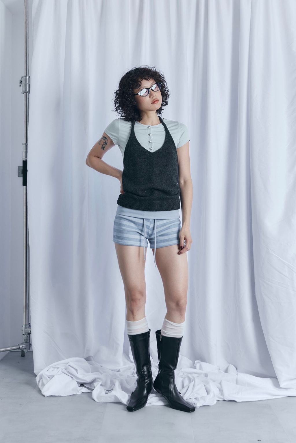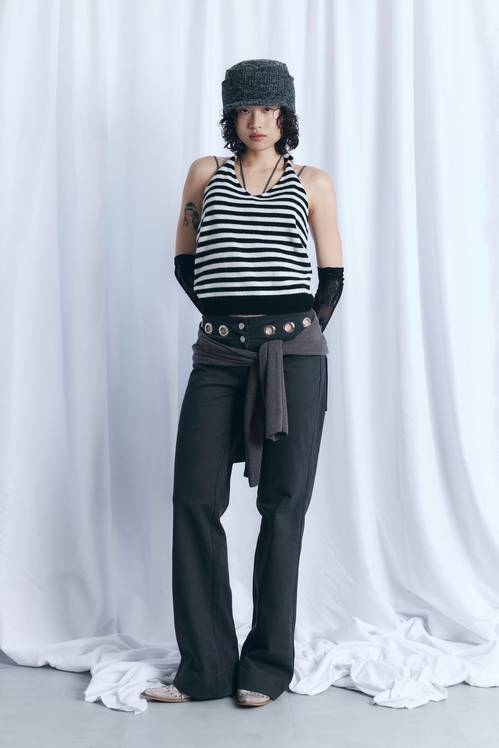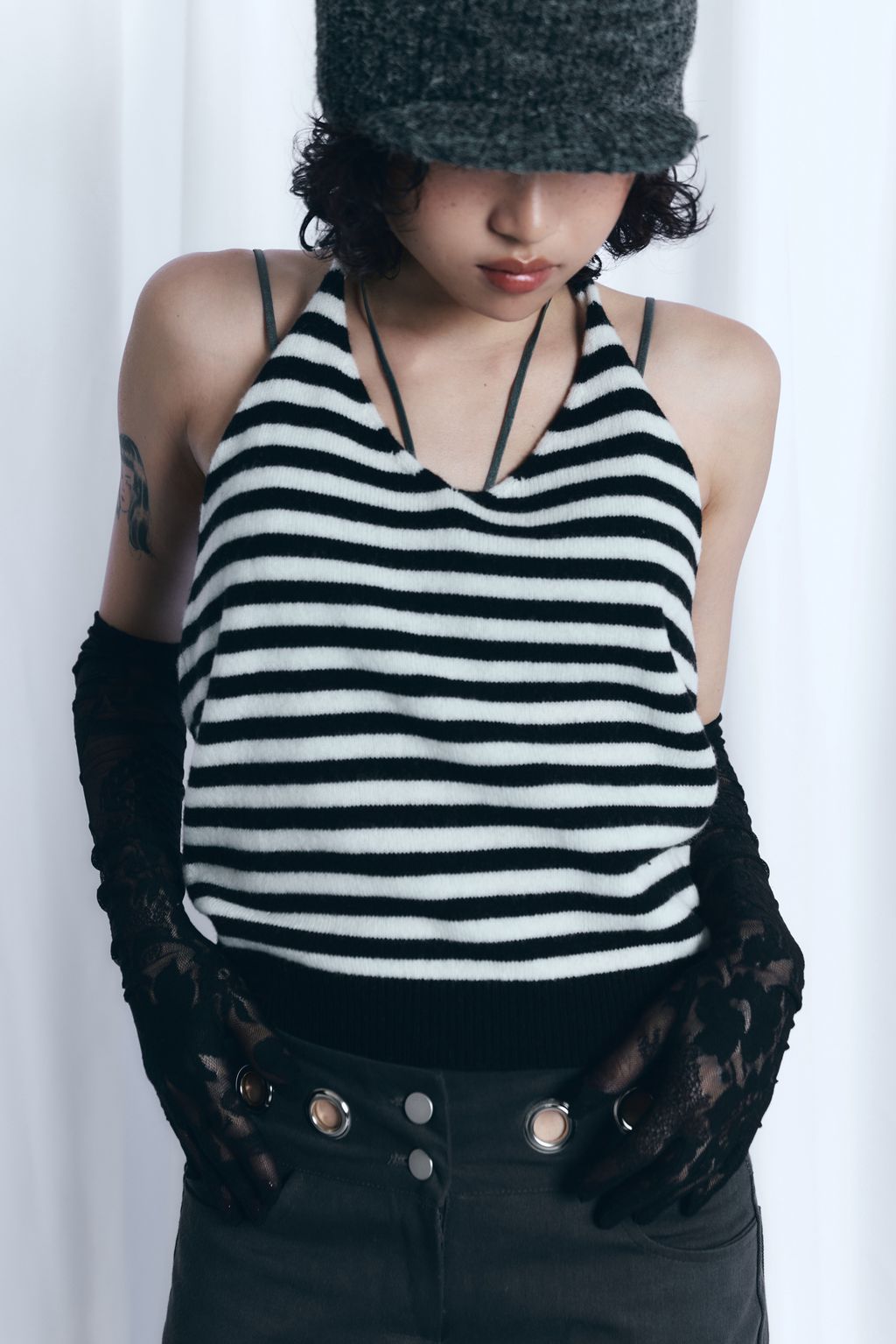 / 韓國設計師品牌 / 暖呼繞脖綁帶背心 - 炭灰 / 條紋