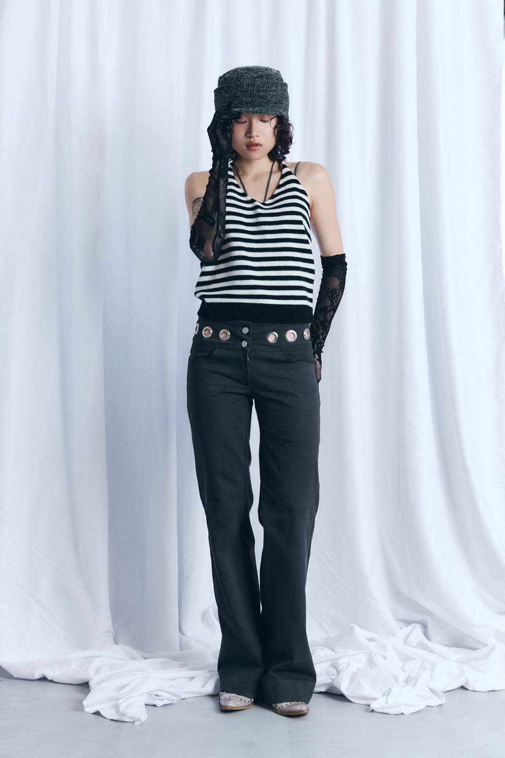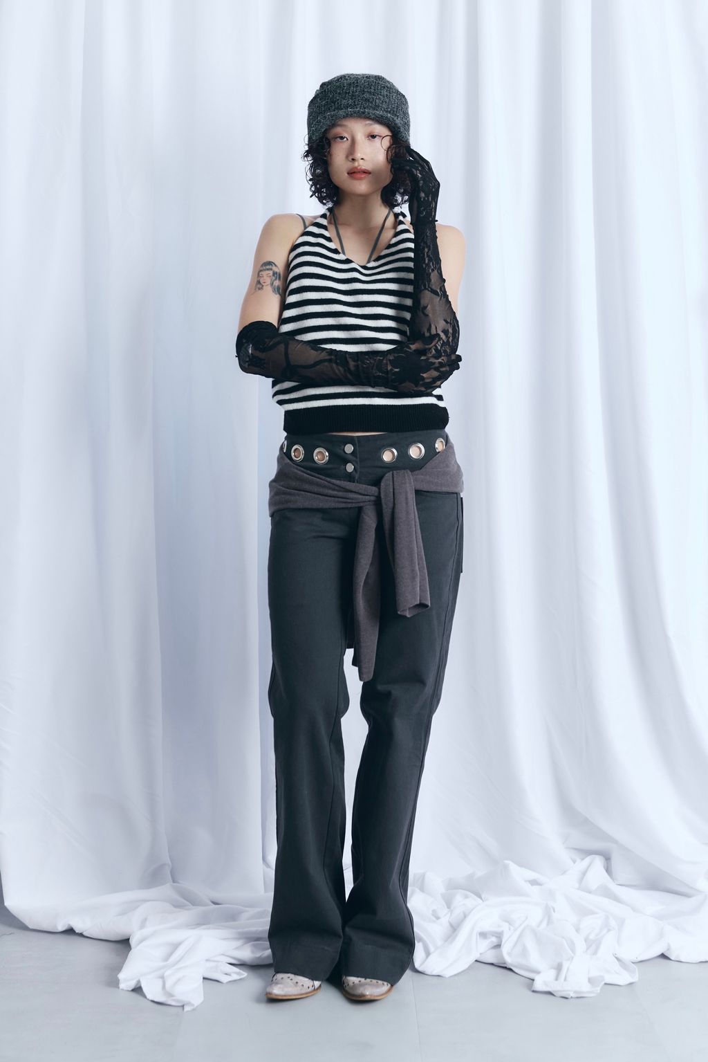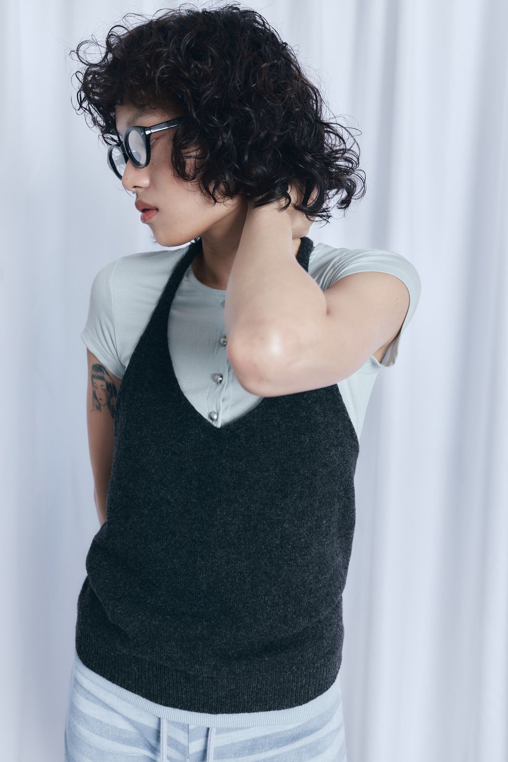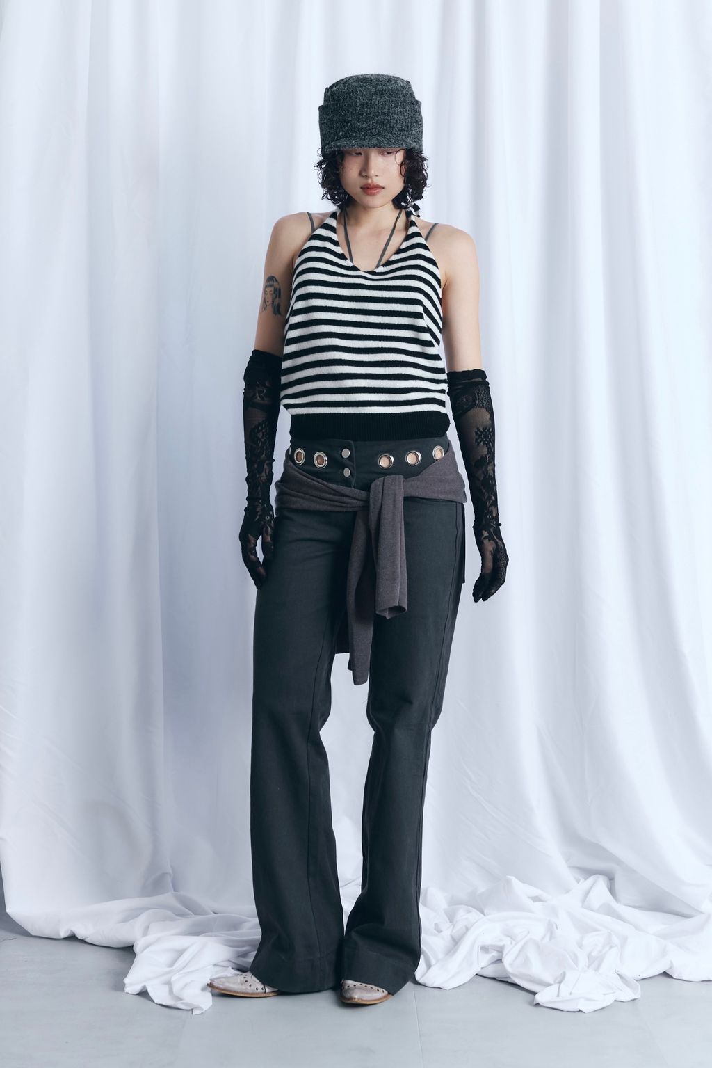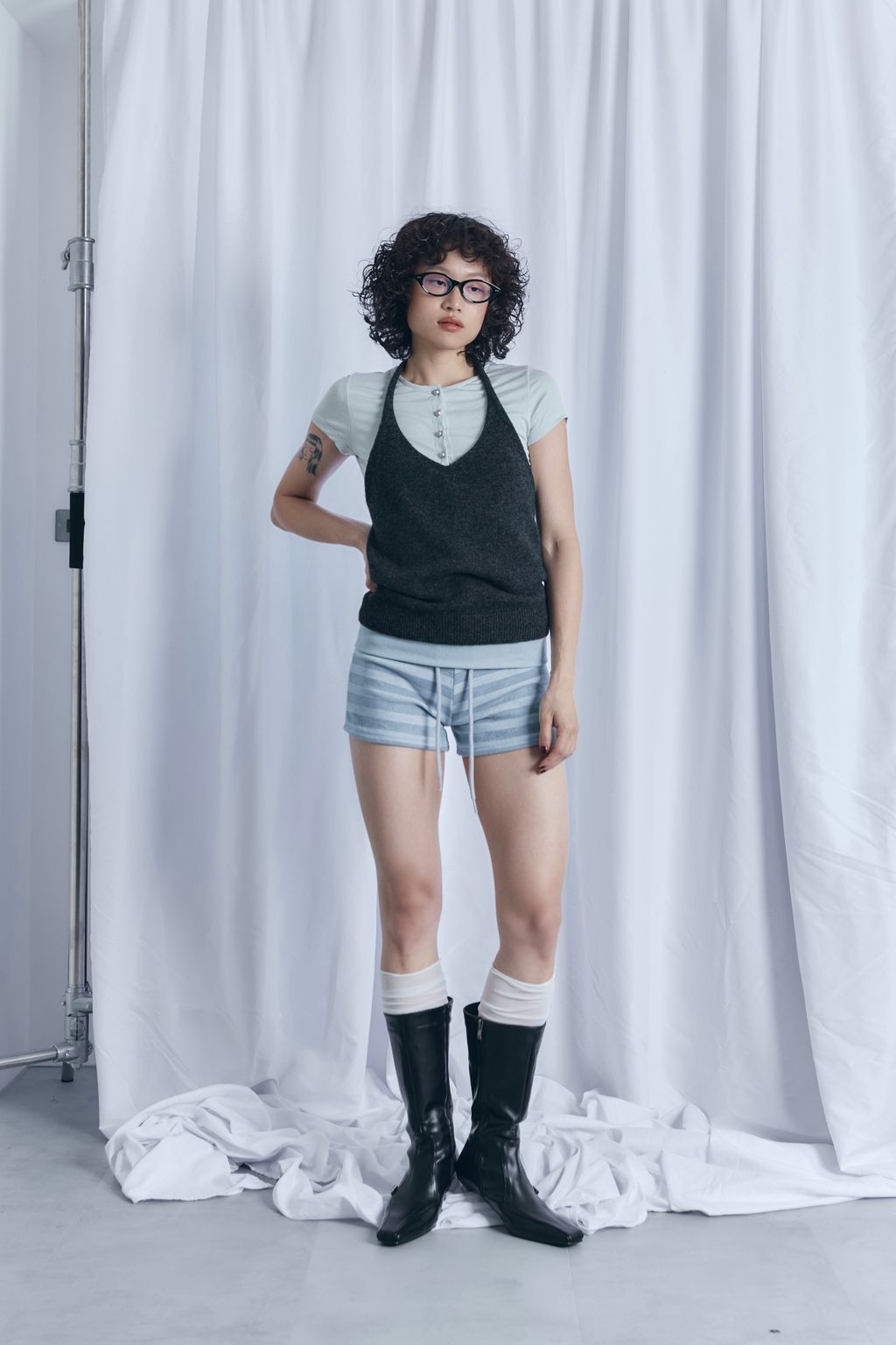 / 韓國設計師品牌 / 暖呼繞脖綁帶背心 - 炭灰 / 條紋