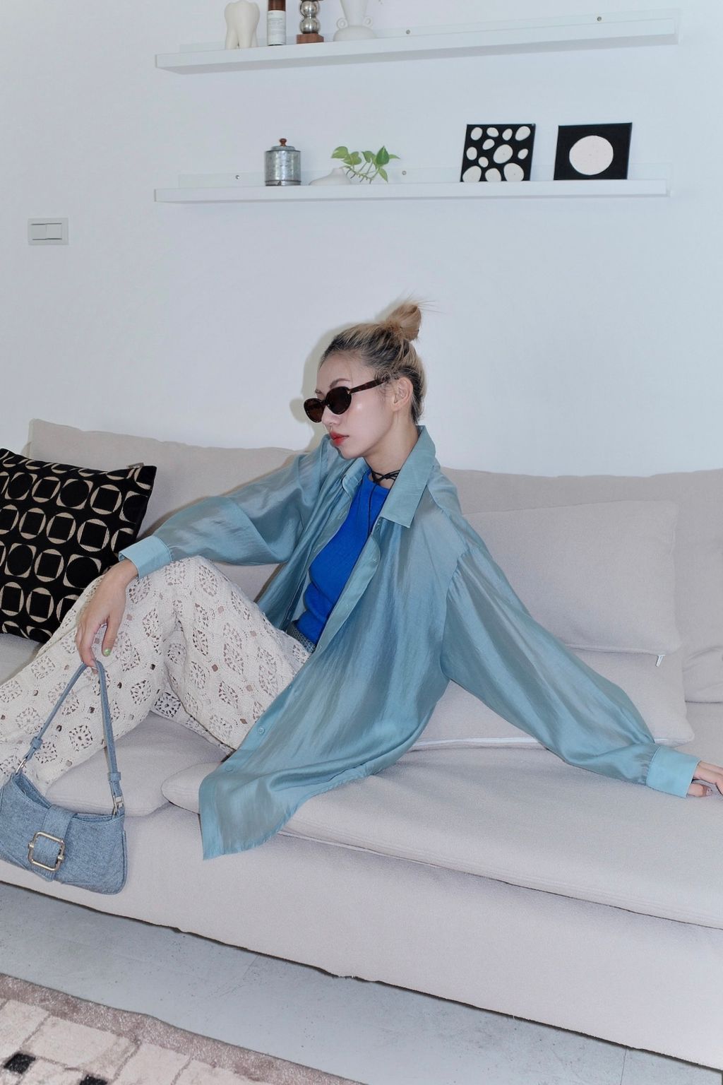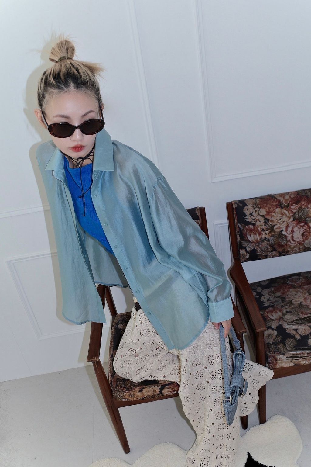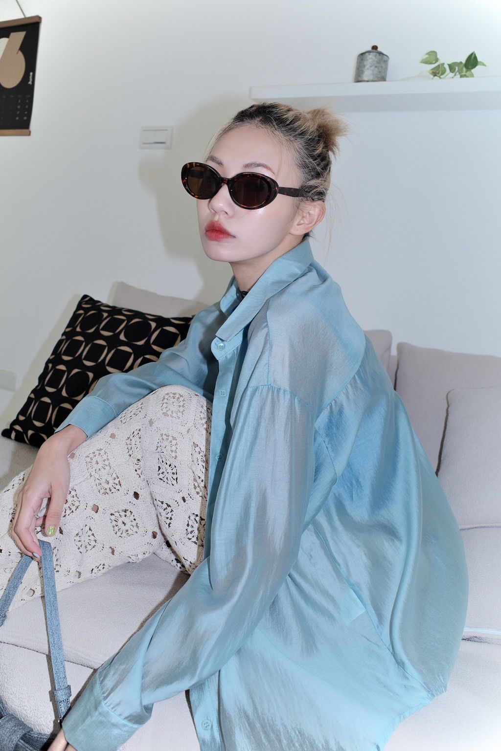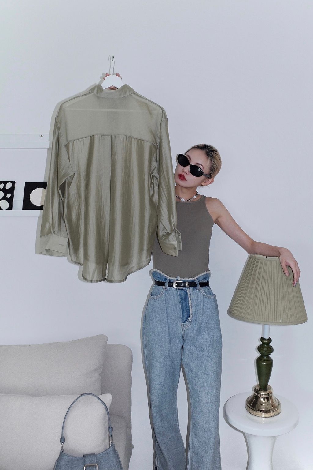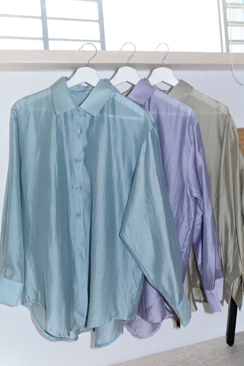 光澤透膚後開岔襯衫-藍/橄欖綠/紫